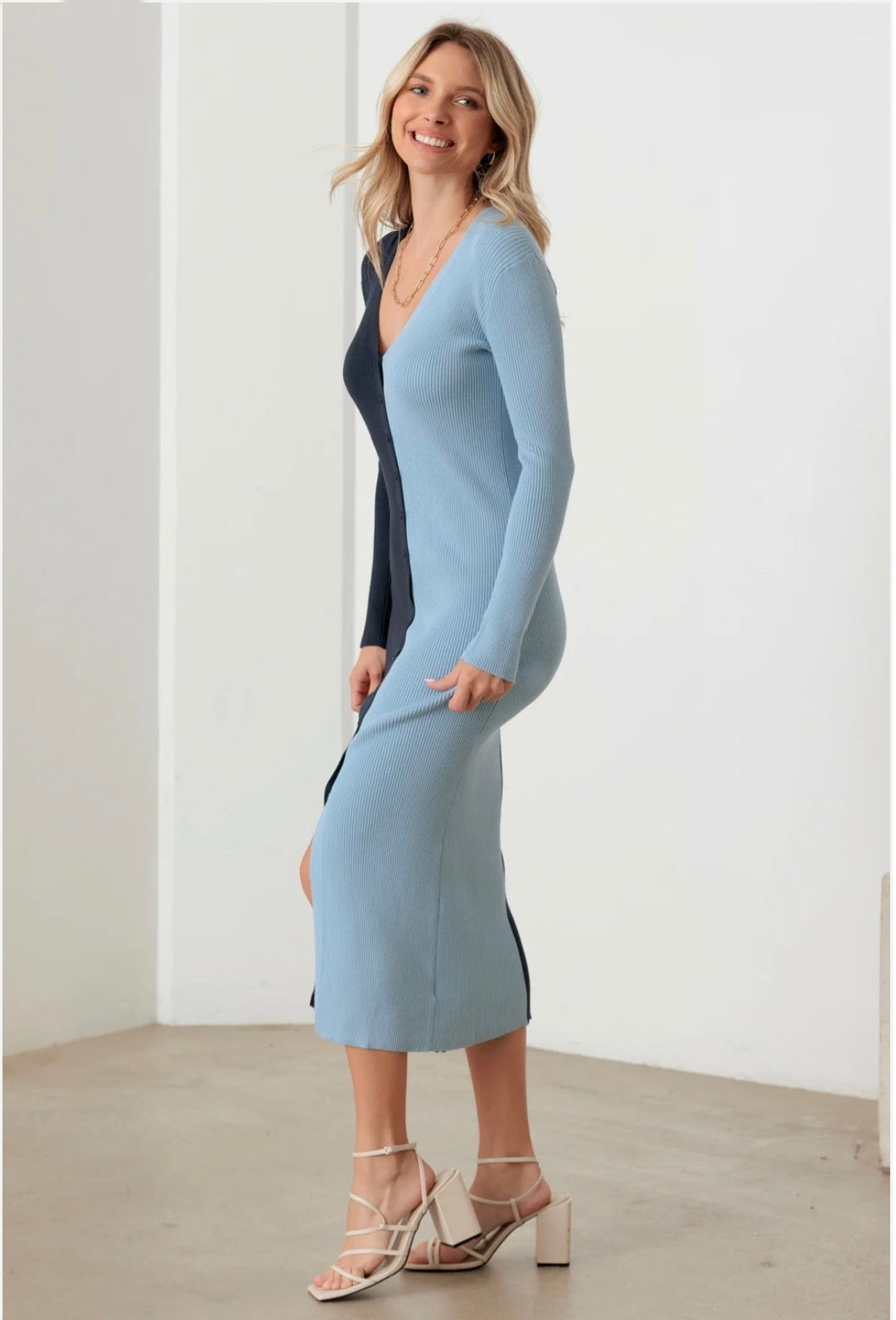 Brooke Ribbed Two Tone Button Down V-Neck Knit Maxi Dress