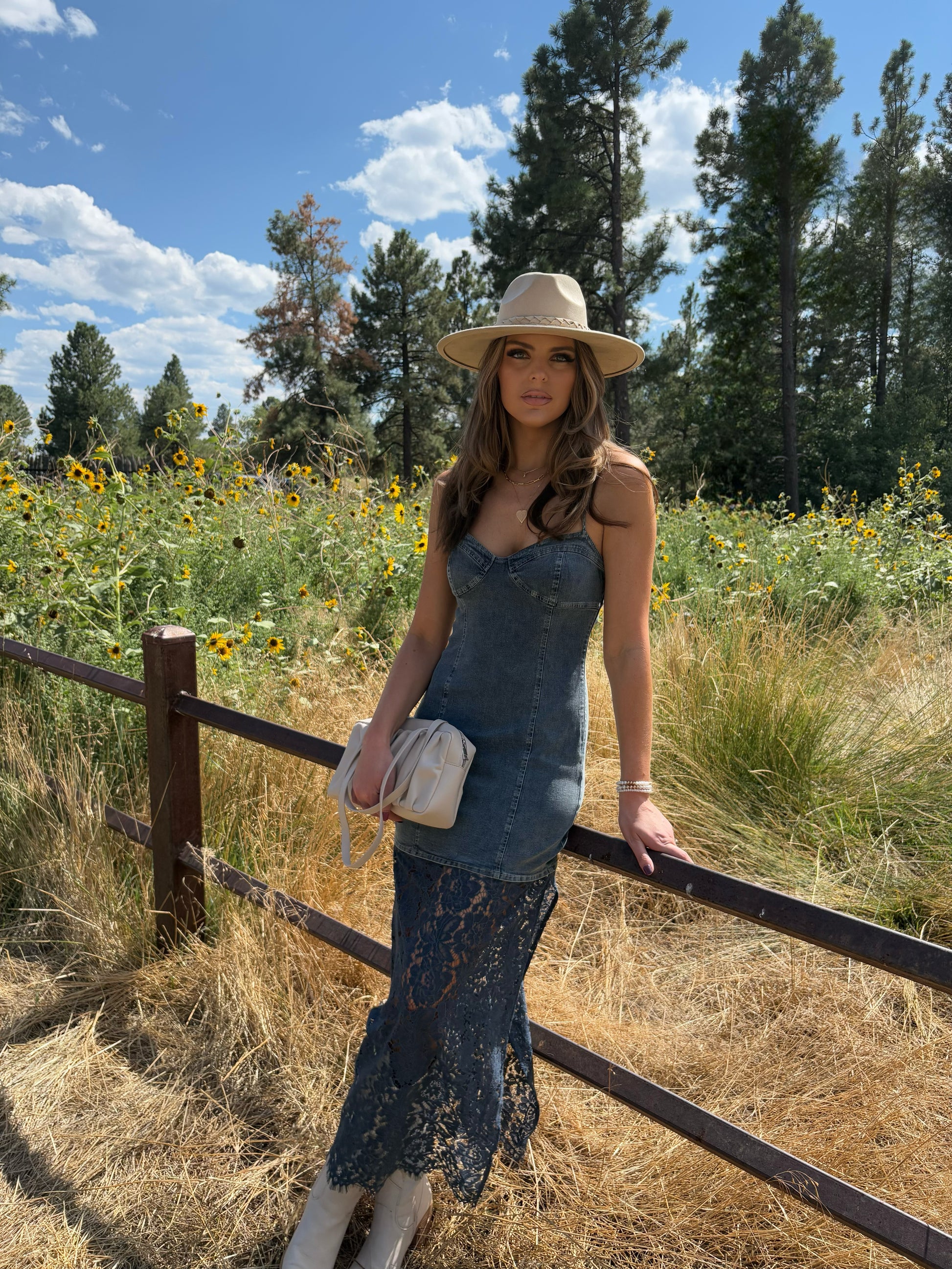 Unleash your bold and daring side with our Harper Denim Corset Lace Hem Maxi Dress. Designed with a corset top to enhance your curves, this dress exudes edgy sophistication. The delicate lace hem adds a touch of femininity, making it perfect for a girls' night out or a special occasion. Ready to conquer the night? Just slip into this must-have dress!