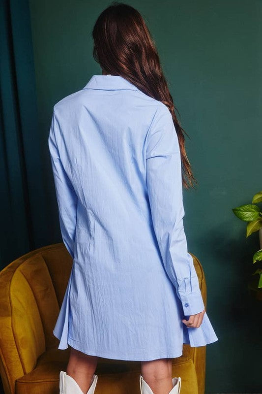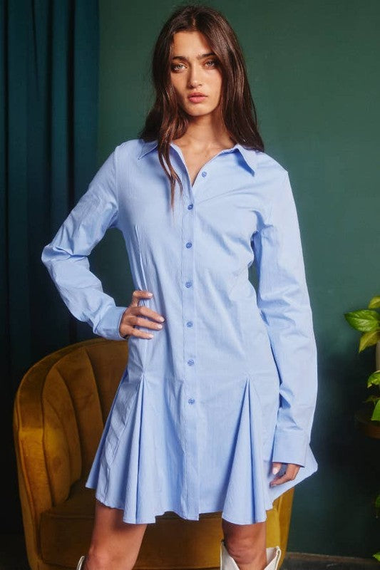 For those who crave a fashion adventure, the Kenny Long Sleeve Button Down Pleated Dress is a must-have. The light blue color and long sleeves give a bold, confident look, while the pleated design adds a touch of playfulness. Perfect for fall weather, this dress is both versatile and daring.